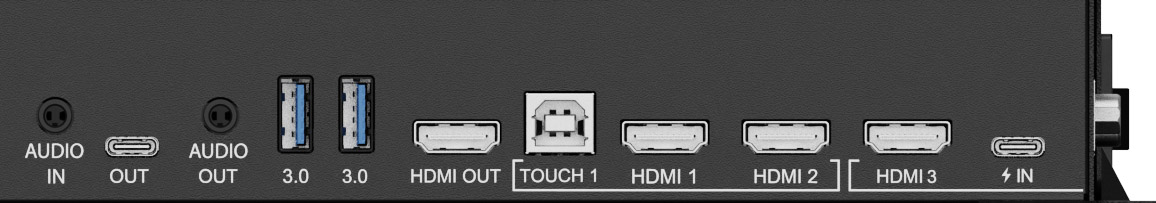 *Digital signal input HDMI x4 (2.0, max. 3840x2160 @60Hz, YUV420/ YUV444/ RGB444), DisplayPort x1 (2.1, max. 3840x2160 @30Hz), USB-C x2 (3.2 (Gen 1, 5Gbit), 3840x2160 @60Hz (RGB444), DP 1.2 Alt mode, Touch, 1x front: 100W PD , 1x back: 15W PD)