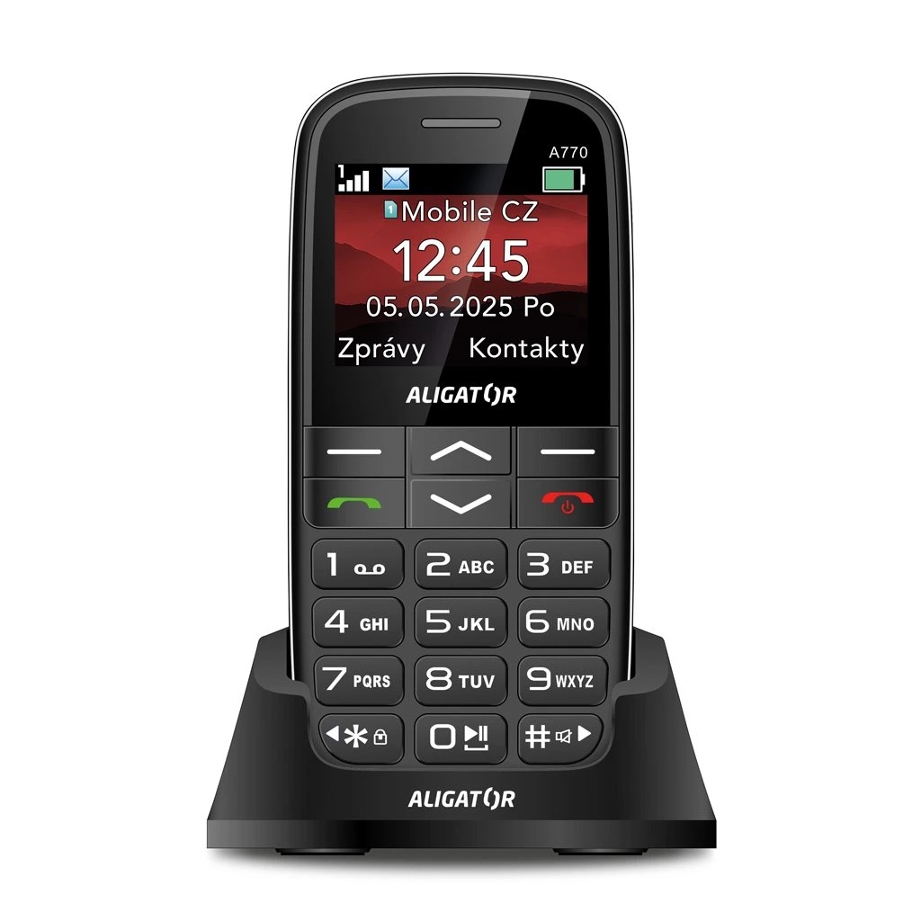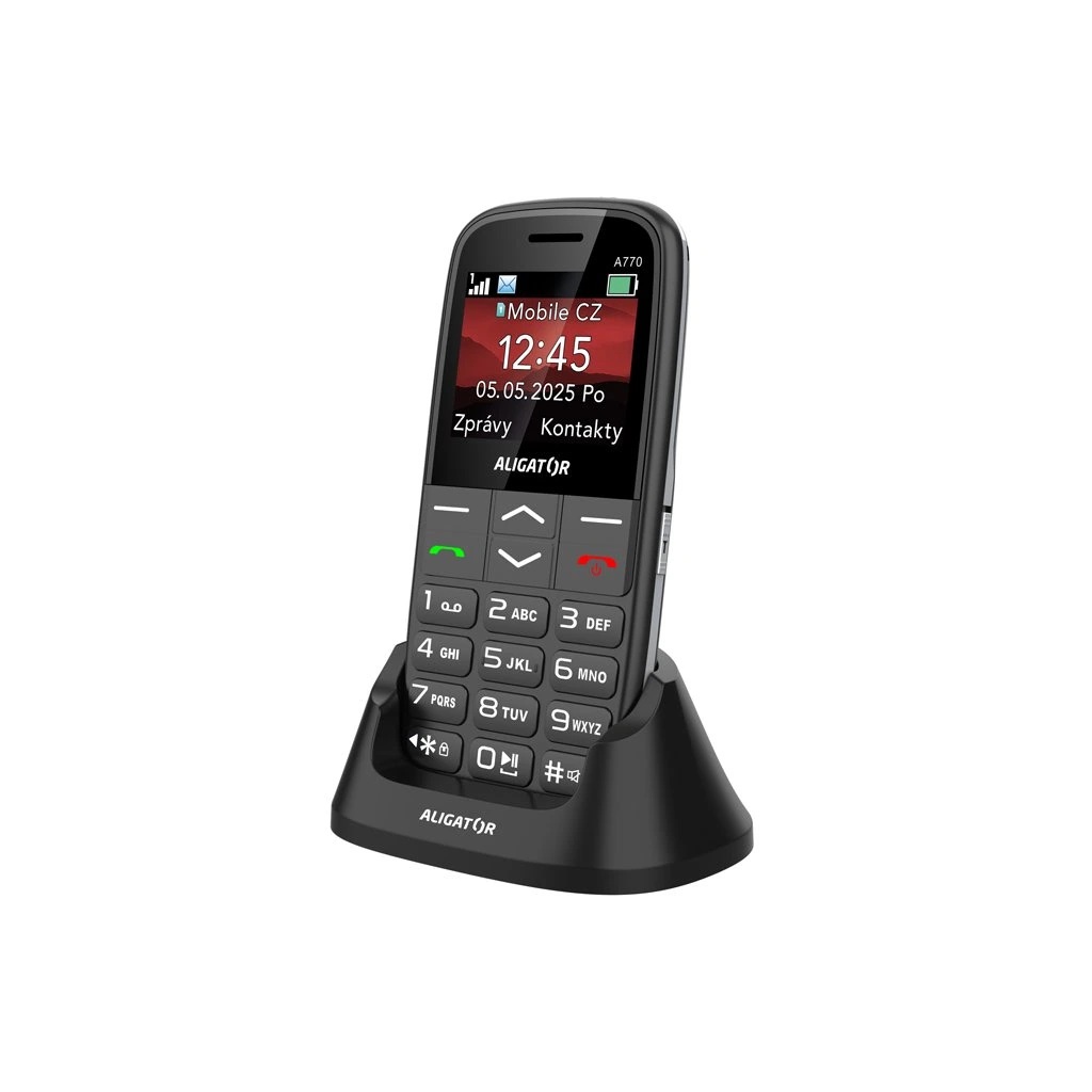Obsah balení: Telefon Aligator A770, nabíjecí stojánek, návod k použití (bez nabíječky)