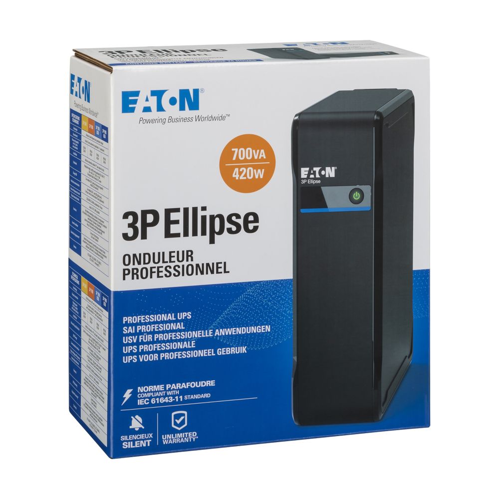 Eaton 3P Ellipse UPS FR, 700 VA, 420 W, Vstup: C14, Výstupy: (3) Typ E, (1) Pouze přepěťová ochrana Typ E, Tower