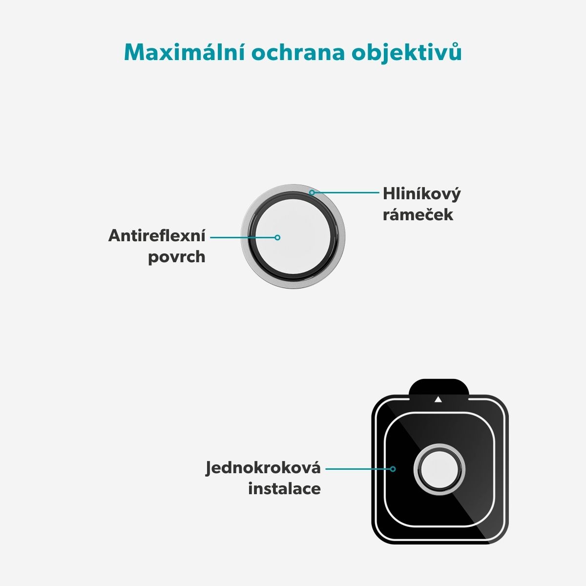 Maximální ochrana objektivů s hliníkovými rámečky Dopřejte svému iPhonu dokonalou ochranu fotoaparátu díky Aluminium Lens Protectors. Tato ochrana objektivů s hliníkovými rámečky účinně chrání objektivy před poškrábáním a nárazy, takže se nemusíte obávat opotřebení z každodenního používání. Speciální antireflexní povrch zajišťuje, že vaše fotografie i videa budou vždy ostré a kvalitní za všech podmínek. Bezchybná kvalita fotografií a snadná instalace Aluminium Lens Protectors jsou dostupné v ladících barvách, které se dokonale přizpůsobí barvě vašeho iPhonu, nebo je můžete libovolně kombinovat podle svého vkusu. Černé kroužky brání vzniku nežádoucích odlesků a zachovávají 100% kvalitu obrazu. S vrstvou proti otiskům prstů objektivy zůstanou čisté a odolné vůči veškerým šmouhám. Instalace je otázkou pár vteřin – díky instalačnímu rámečku, čisticímu hadříku a nálepce na odstranění prachu je aplikace rychlá a bezproblémová.
