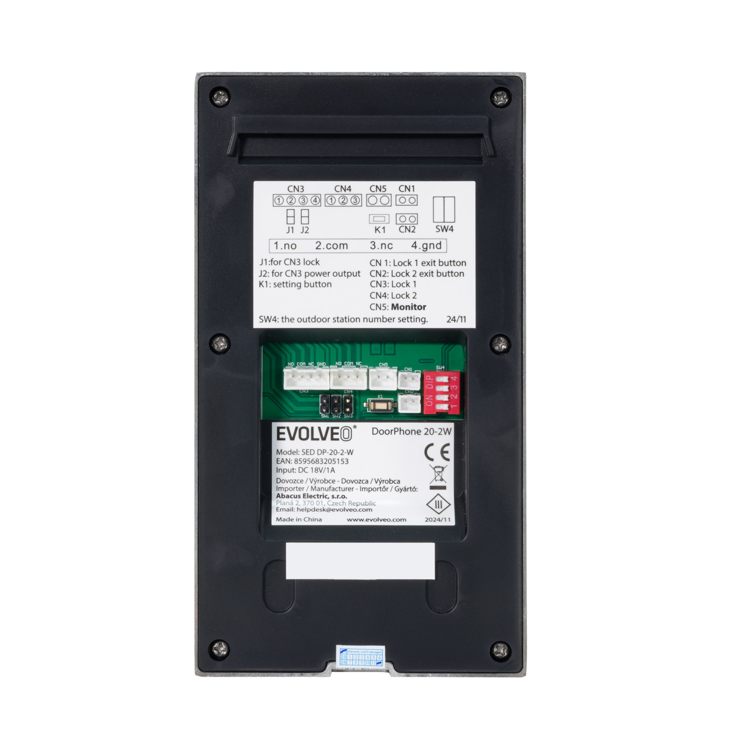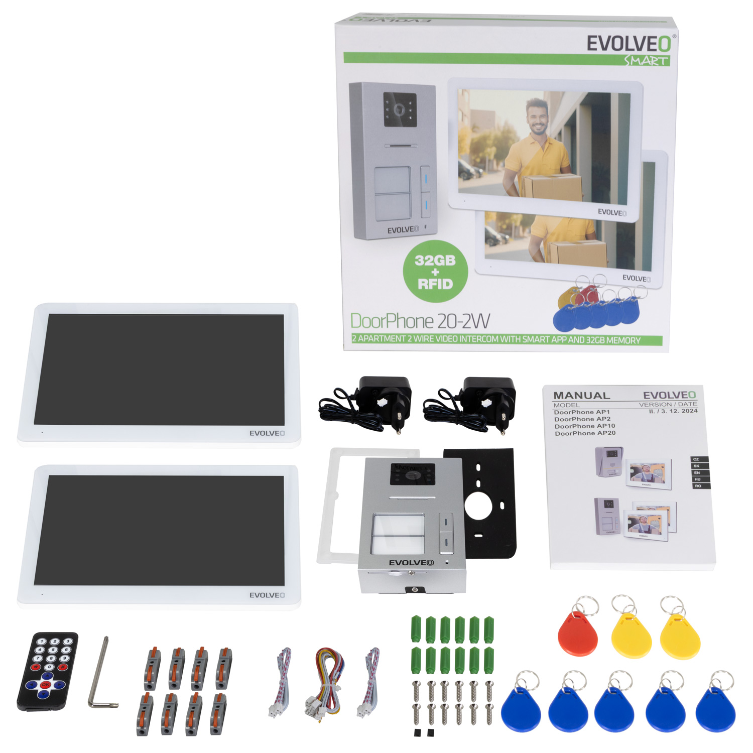 • Venkovní jednotka (s kamerou 1080P a RFID čtečkou) • 2× Vnitřní monitor 10,1" WiFi (dotykový LCD displej) • 2× Montážní rámeček pro monitory • Upevňovací šrouby a hmoždinky • 2× Napájecí adaptér 18V DC • Propojovací kabely s konektory • Montážní rámeček pro venkovní jednotku + těsnění • RFID karty (žlutá administrátorská, červená pro mazání, modré uživatelské) • Návod k použitíTECHNICKÁ PODPORA A SERVIS: podpora@evolveo.cz