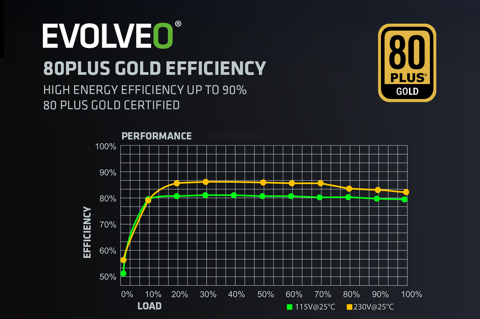 PC zdroj EVOLVEO G750-BK je hrdým držitelem certifikace80 PLUS Gold, která slibuje až 92% účinnost (při běžném 50% zatížení). Minimální ztráty energie a nízké zahřívání jdou přitom ruku v ruce s tichým chodem