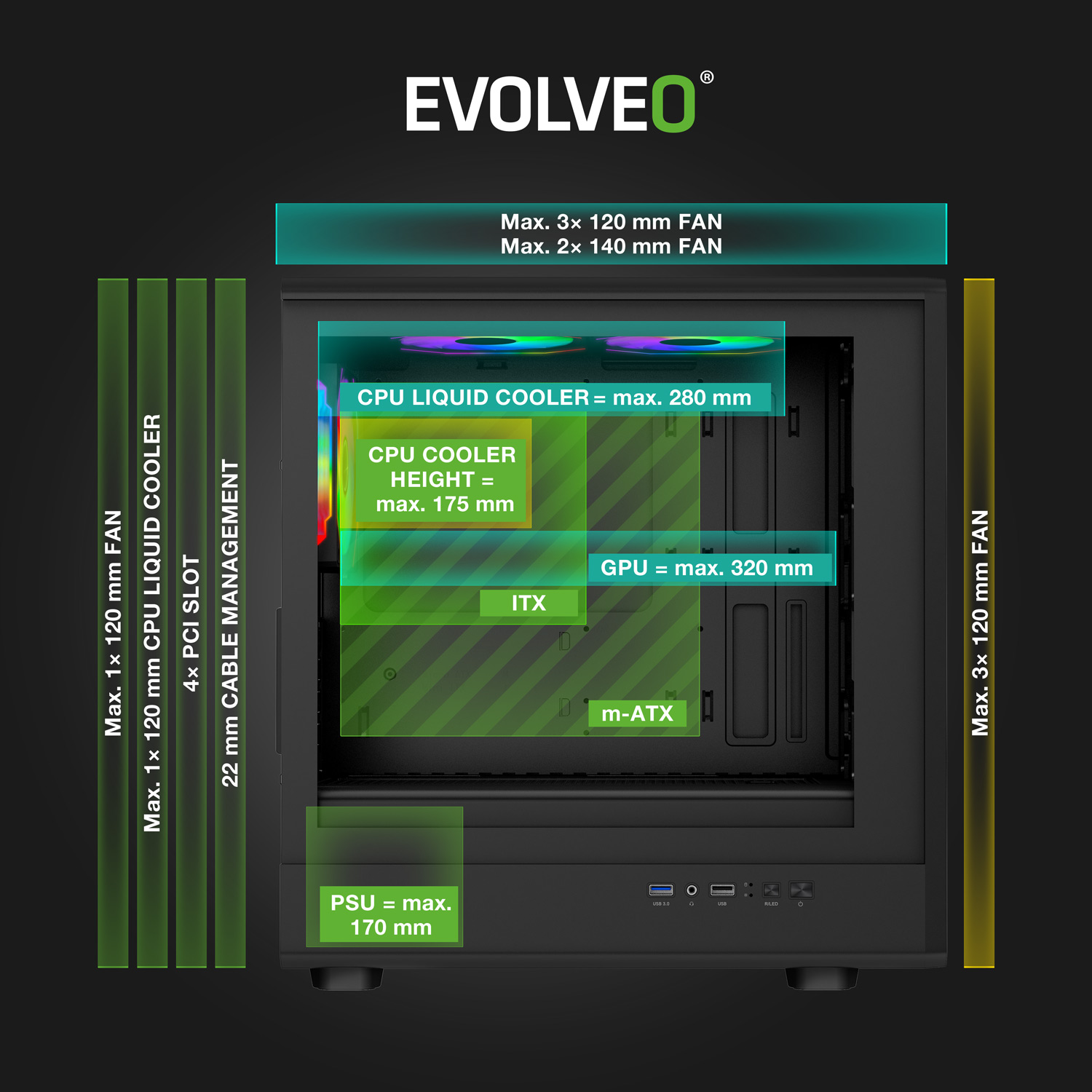 • mATX • Dřevěný čelní panel • Ventilátory ARGB 120 mm • 3x Infinity Mirror Fan • Bočnice z temperovaného skla • Tři prachové filtry • VGA max. 320 mm • CPU max. 175 mm • 2x 3,5" HDD • 1x 2,5" SSD EVOLVEO Panthera, skříň…