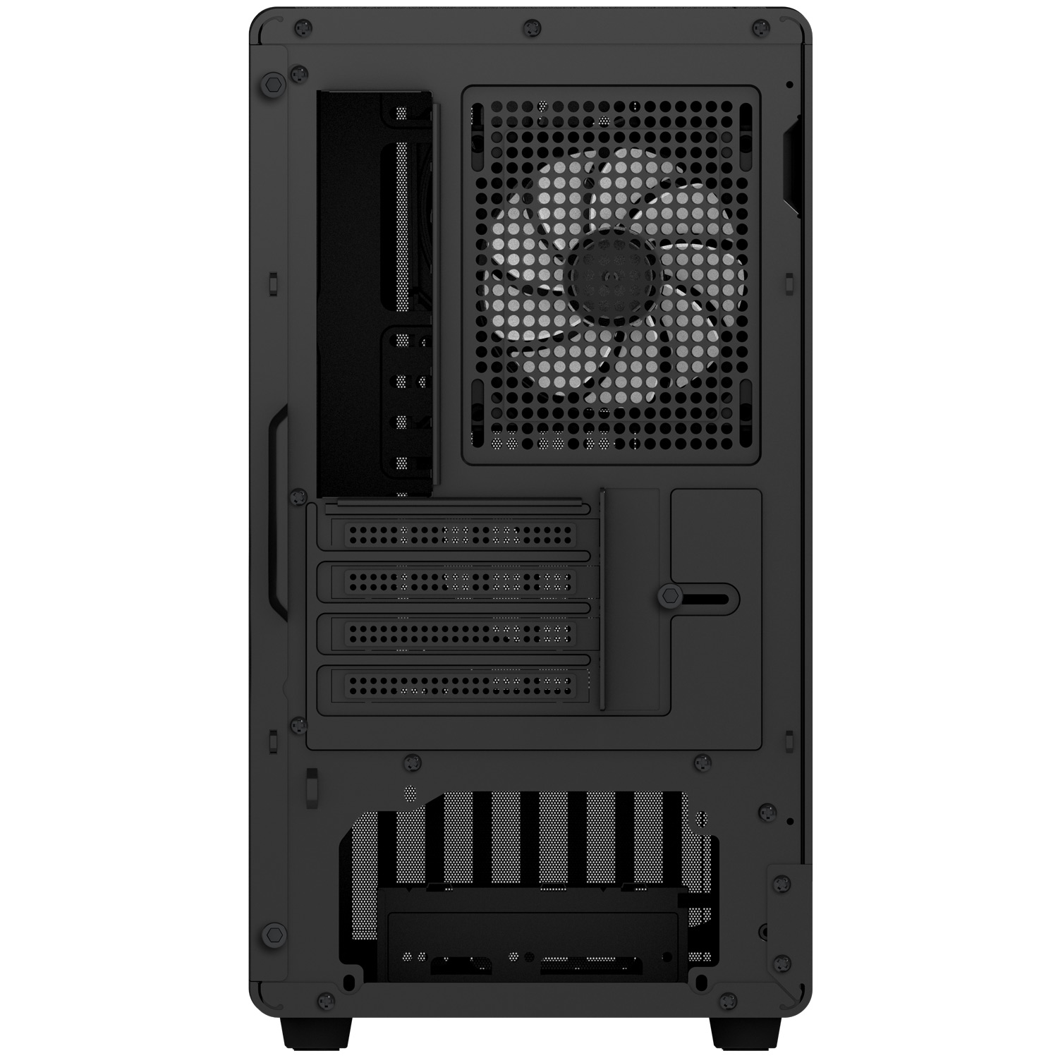 • Ovládací panel na levé straně skříně: 1) Vypínač ON/OFF 2) Tlačítko pro ovládání ARGB ventilátorů (mění barvu podsvícení ventilátorů, aktivuje ovládání podsvícení ventilátorů prostřednictvím základní desky) 3) 1 x USB-A port (v 3.0) 4) 1 x USB-A port (v 2.0) 5) 1 x audio výstupní port /vstup na mikrofon (Jack 3,5 mm) • 22 mm Cable Management pro skrytí kabeláže uvnitř skříně • Optimalizovaná prostorná vnitřní konstrukce pro pohodlnou montáž komponent • 4 rozšiřujících PCI sloty sloužící k montáží a vyvedení portů z rozšiřujících karet vložených do základní desky