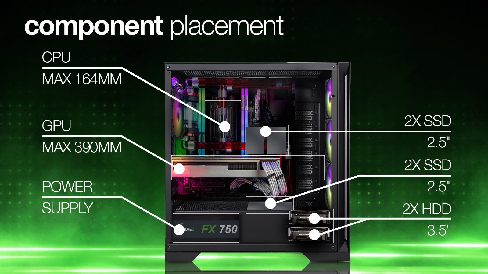 Průhledná odnímatelná bočnice: 1) Vyrobena z bezpečnostního 4 mm silného temperovaného skla (při rozbití se rozsype na bezpečné drobné kousky bez ostrých střepů) 2) Snadná demontáž a montáž pomocí dvou šroubů s dvěma možnostmi utažení (rukou nebo šroubovákem) • 2x 3,5" HDD • 3x 2,5 " SSD • Maximální délka VGA karty: 390 mm • Maximální výška CPU chladiče: 164 mm • Robustní konstrukce (plechy o tloušťce 0,6 mm) • Systém „QuintFlow“ pro optimální průtok vzduchu a přirozené chlazení celé skříně díky pěti vzduchovým proudům přes čelní, horní, spodní, zadní a boční voštinové průduchy • Podpora základních desek Intel i AMD • Předinstalované ventilátory ve skříni: 1x ARGB master, 3x ARGB slave •