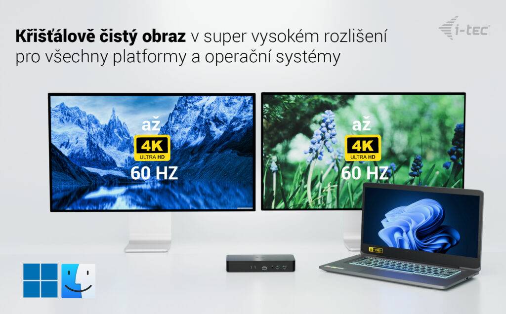 • Dokovací stanice s velmi vysokým výkonem a podporou připojení až dvou externích monitorů v rozlišení 4K/60 Hz (libovolné zařízení, libovolný operační systém)
