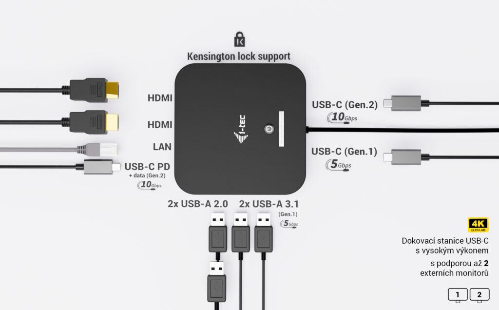 Moderní USB-C dokovací stanice pro kancelářské použití s podporou až dvou externích monitorů v rozlišení 4K. Stanice je kompatibilní s jakýmkoli notebookem vybaveným portem USB-C, USB4 nebo Thunderbolt 3/4/5. Nabízí 6 USB portů, spolehlivé a rychlé připojení k firemní síti díky integrovanému LAN portu a možnost instalace za monitor, což z ní dělá ideálního partnera pro profesionální použití. Samozřejmostí je také schopnost nabíjení notebooku nebo tabletu výkonem až 100 W.