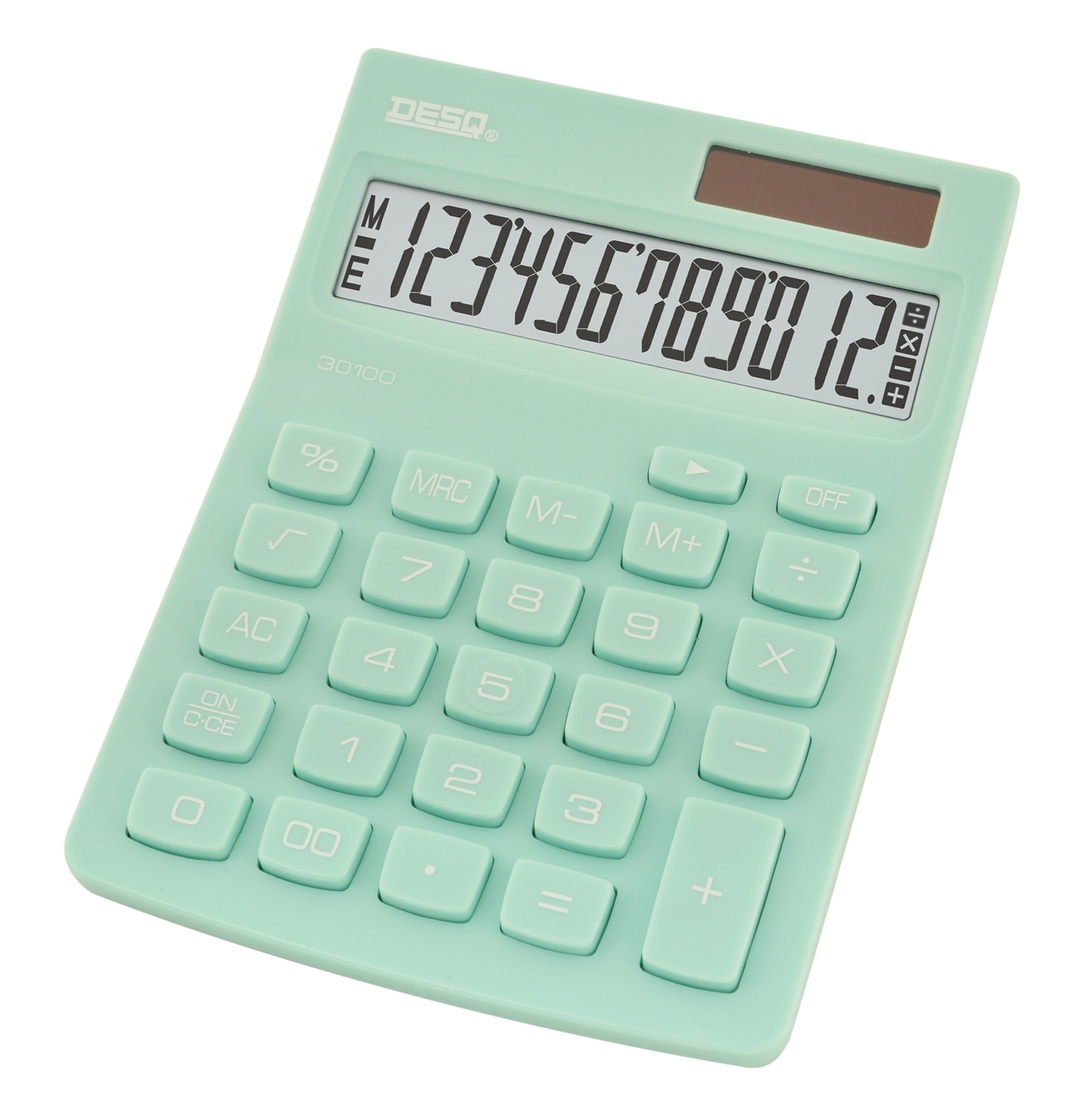 - Stolní kalkulačka v mátové barvě - 12ti místný LCD displej - Funkce Backspace, tlačítko s dvojitou nulou - Tlačítka pro výpočet procent a odmocniny - Trojciferná interpunkce - 3 tlačítková paměť - Automatické vypnutí, které šetří energii - Napájení pomocí solárního panelu nebo baterie AG10 / LR1130 (součástí balení) - Hmotnost 110 g - Rozměr 142 x 102 x 31 mm
