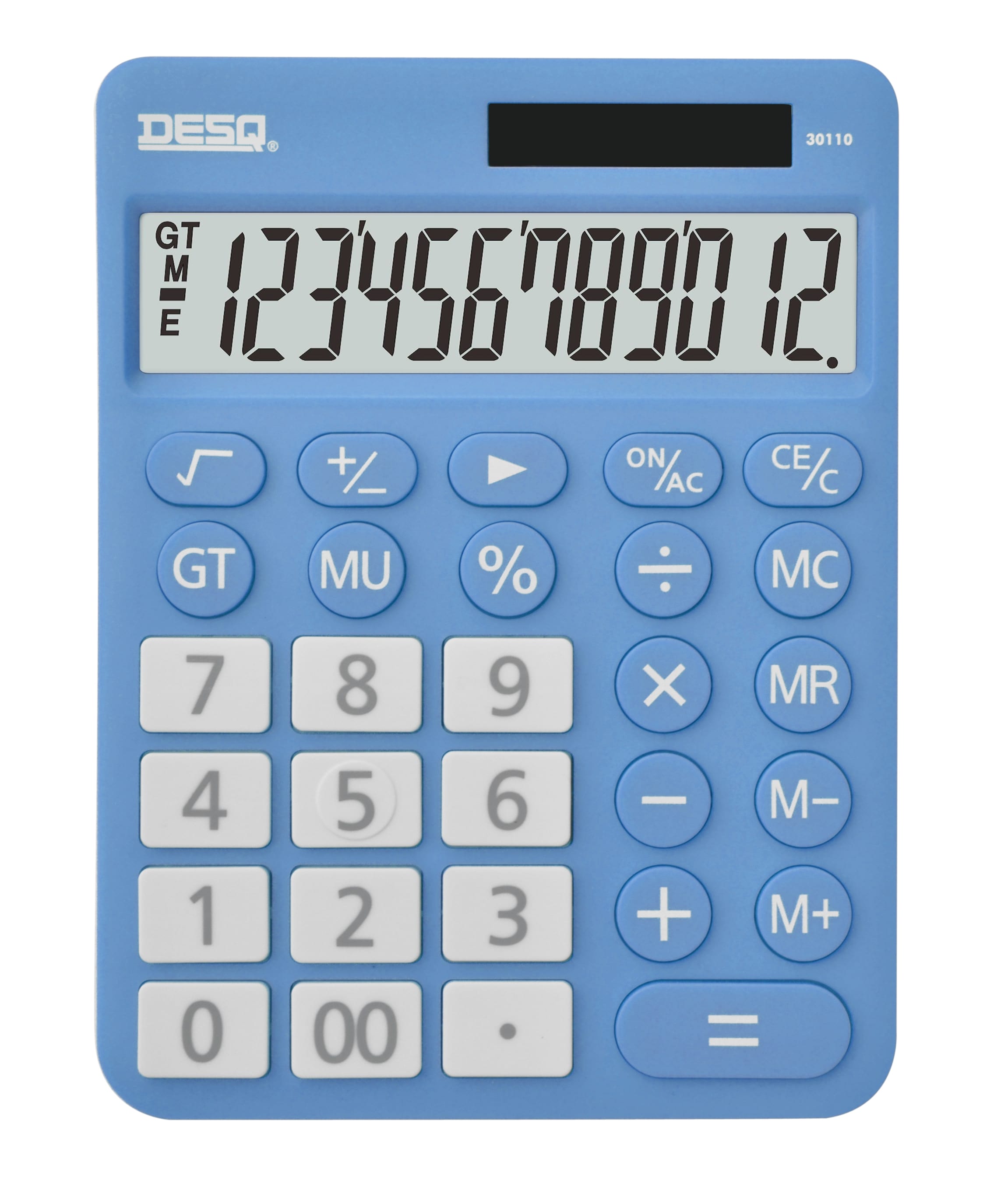 - Velká stolní kalkulačka ve světle modré barvě - 12ti místný LCD displej - Velká tlačítka - Funkce MU, GT, Backspace, tlačítko s dvojitou nulou, tlačítko (+/-) - Tlačítka pro výpočet procent a odmocniny - Trojciferná interpunkce - 4 tlačítková paměť - Automatické vypnutí, které šetří energii - Napájení pomocí solárního panelu nebo baterie AAA (součástí balení) - Hmotnost 200 g - Rozměr 185 x 140 x 30,5 mm