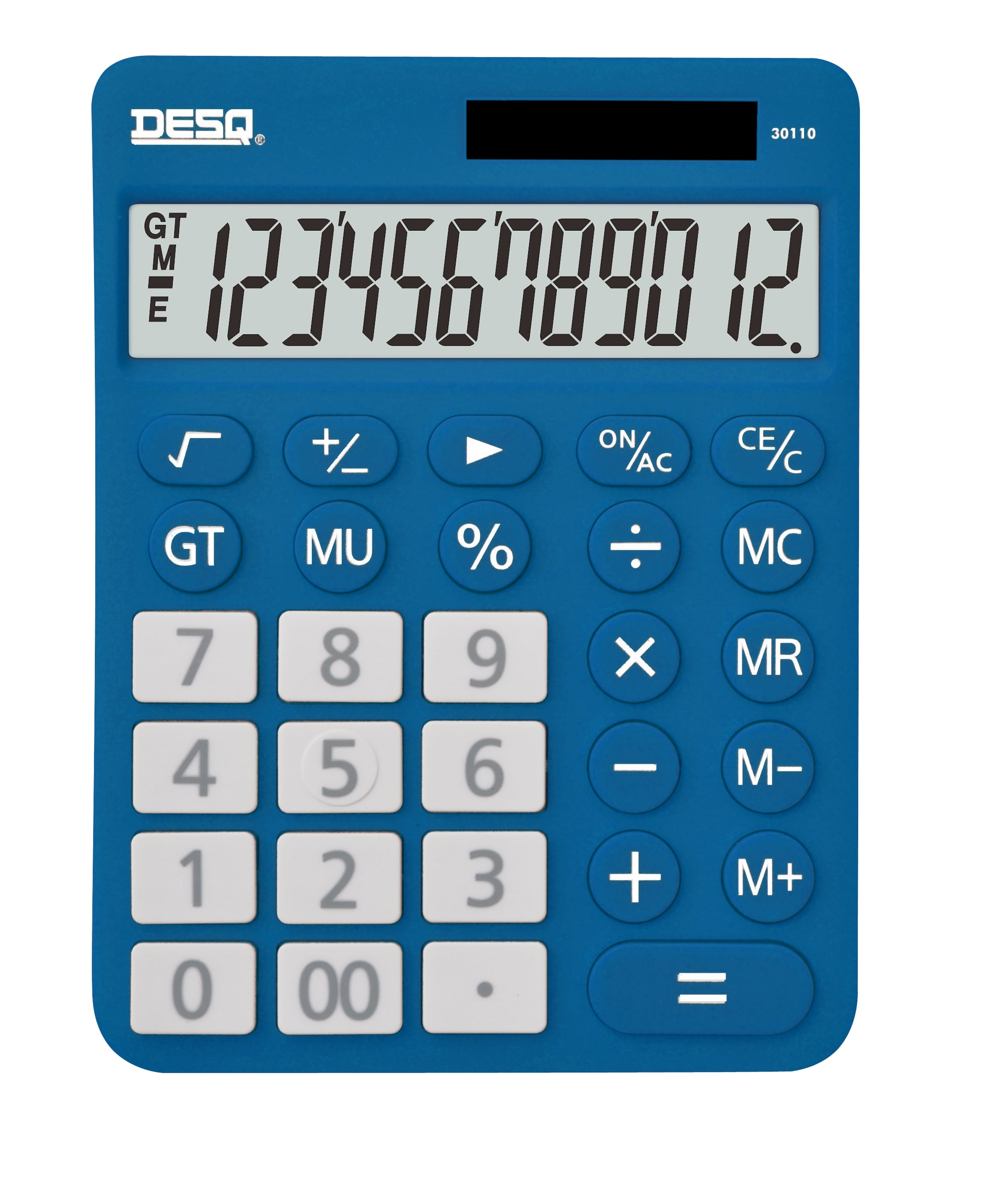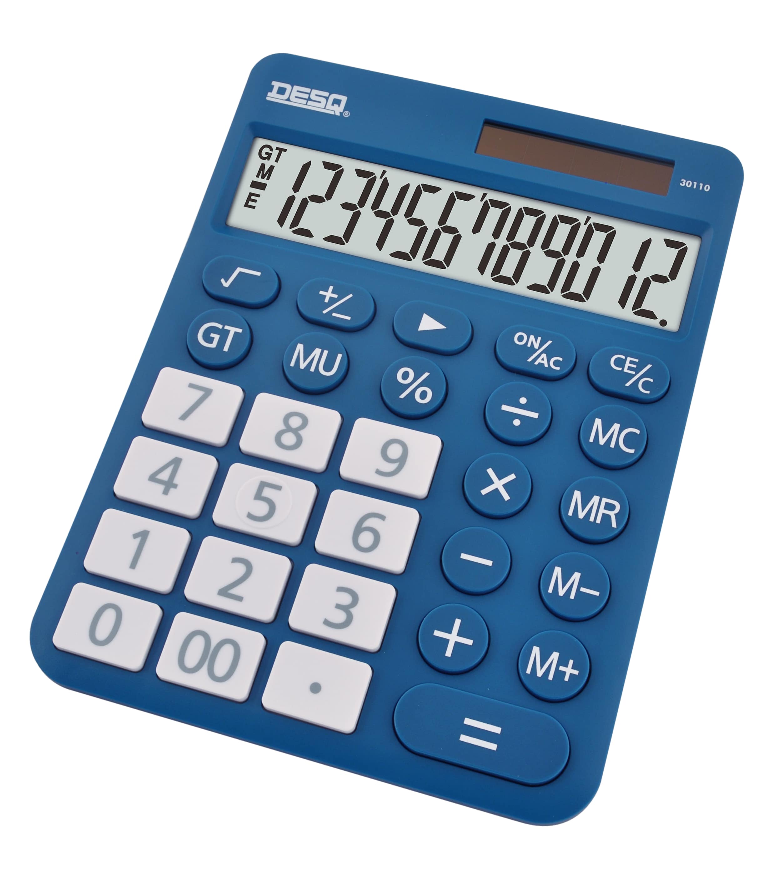 Velká stolní kalkulačka v tmavě modré barvě 12ti místný LCD displej Velká tlačítka Funkce MU, GT, Backspace, tlačítko s dvojitou nulou, tlačítko (+/-) Tlačítka pro výpočet procent a odmocniny Trojciferná interpunkce 4 tlačítková paměť Automatické vypnutí, které šetří energii Napájení pomocí solárního panelu nebo baterie AAA (součástí balení) Hmotnost 200 g Rozměr 185 x 140 x 30,5 mm