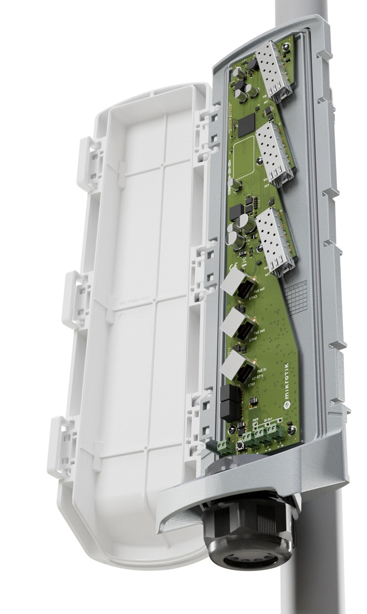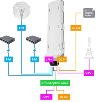 Řešení pro náročné venkovní instalace, kde je potřeba rozdělit data a napájení z jednoho hybridního kabelu na více zařízení. Switch GPERx6 kombinuje 3 Gigabit Ethernet porty s PoE funkcionalitou, 3 vysokorychlostní 10G SFP+ porty pro optické spoje a 3 DC výstupy pro napájení IoT zařízení nebo specializovaných přístrojů.
