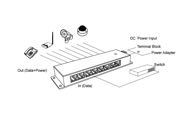 Panel integrující 4 pasivní POE injektory vhodný pro napájení až 4 aktivních prvků.. Univerzální řešení pro vzdálené napájení většího počtu aktivních prvků s integrovaným extraktorem po UTP kabeláži. Provedení s plastovým krytem a 2.1mm DC zásuvkou. Do RJ45 konektorů na jedné straně se připojují ethernetové porty bez napájení (např. switch), na opačnou stranu se připojují zařízení využívají napájení po ethernetovém kabelu. K napájení se využívají dva nepoužité páry ethernetového kabelu. Napájecí páry: 4,5 (kladný pól) / 7,8 (záporný pól) Rozhraní: 4x RJ45 konektor pro připojení do LAN (Data) 4x RJ45 konektor pro sloučený výstup (Data+Napájení) Max. vstupní napětí: 48V, 4A Max. výstupní proud: 4A (1A/port) Vstup pro napájení prostřednictvím standardní DC zásuvky 2,1mm. Osazeno LED kontrolkou provozu. Napájecí zdroj není součástí dodávky, volbu a výkonové parametry zdroje je třeba optimalizovat dle příslušných odběrů napájených prvků a jejich konfigurace. Maximální povolené příkonové hodnoty na vstupu do POE panelu: 24V: 62,4W (2,6A) 48V: 124W (2,6A) Technické specifikace: Stínění: Ano Provozní teplota [°C]: 0 až 40 Hloubka [mm]: 82 Šířka [mm]: 42 Výška [mm]: 30 Rychlost ethernetu [Mbps]: 10/100 LED indikace: Ano Napájení na pinech: 4,5 (+), 7,8 (-) Výstupní napětí [V]: 24 Výstupní výkon [W]: 24 Počet PoE Out portů: 4