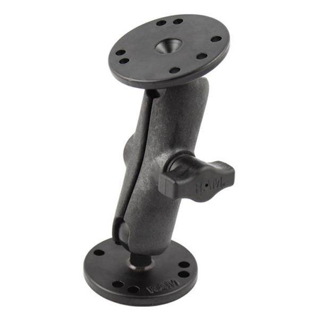 RAM® sestava - střední plastové rameno se dvěmi kulatými základnami 2,5" a kulovým kloubem 1" RAM-B-101U-CIP1 se skládá z ramene s dvojitou objímkou a dvou kulatých základů o průměru 2,5", které obsahují univerzální vzor otvorů AMPS…