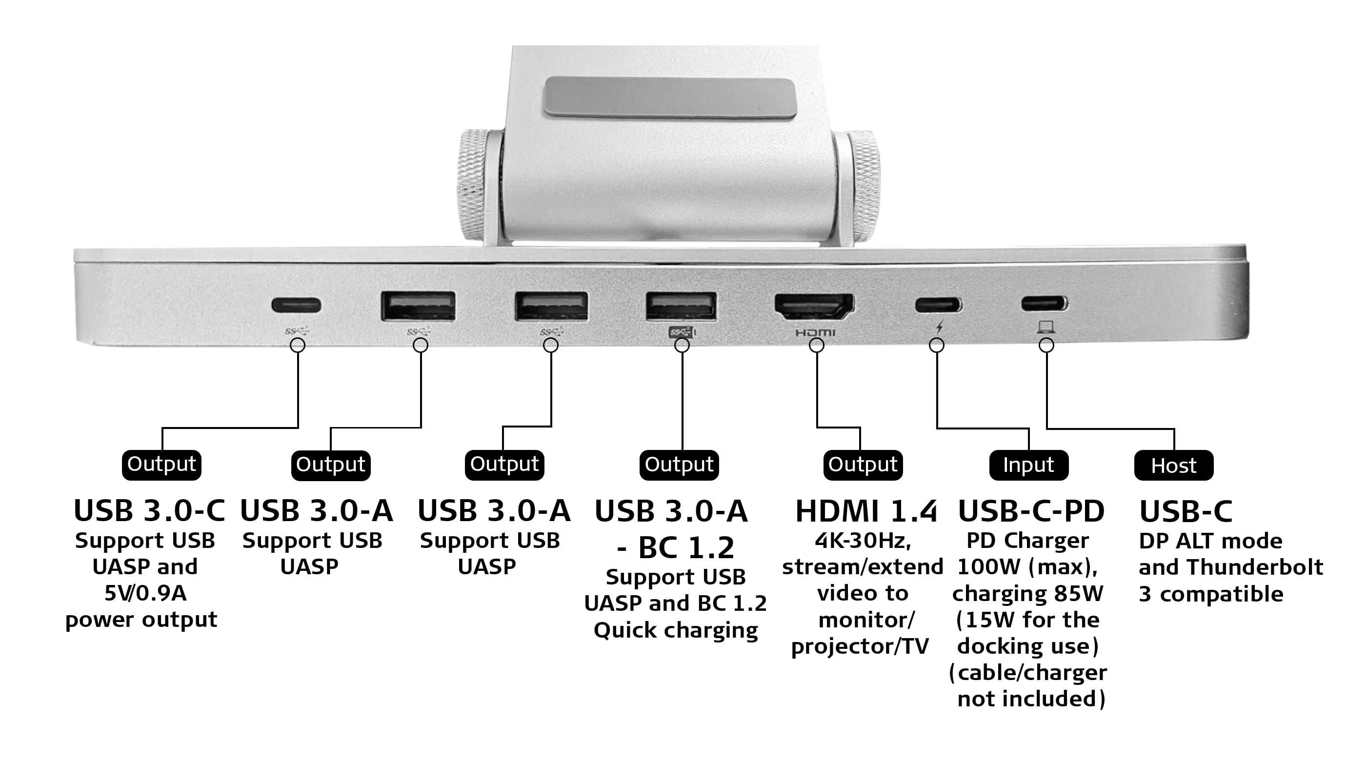 - Plně a snadno nastavitelná hliníková konstrukce s 6ti porty - Velikost notebooku až 15,6" - 3x slot na USB 3.0-A, 1x HDMI, 1x USB 3.0-C, 1x USB-C-PD (Input), 1x USB-C (Host) - Protiskluzový povrch s odvětracími otvory pro lepší chlazení notebooku - Lehká, skládací hliníková konstrukce pro lepší mobilitu - Nastavení v libovolném úhlu až do 70° a možností mít notebook v rovině nebo vyvýšený až o 280 mm - Konektivita: 1x USB-C HOST s podporou Thunderbolt 3 1x USB-C PD max 100W, 85W pro nabíjení 2x USB-A 3.0 1x USB-A 3.0 BC 1.2 Quick charging 1x HDMI 1.4 4K/30Hz 1x USB-C 3.0 UASP s nabíjením 5V/0.9A - Rozměr 274 x 215 x 45,3 mm (složený) - Váha 1191 g - Součástí balení je propojovací kabel USB-C/USB-C
