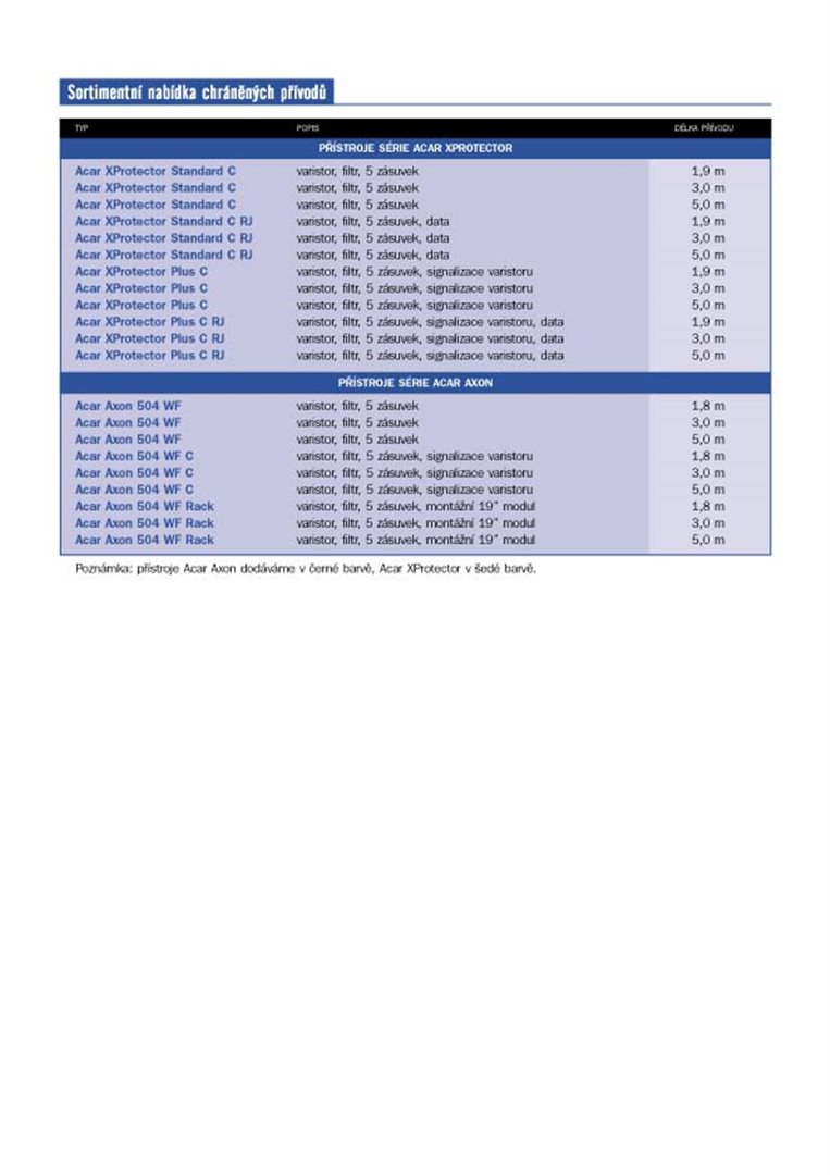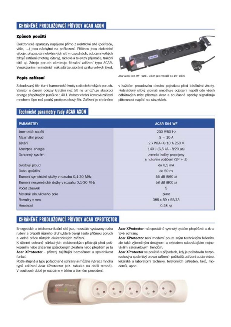 Napájecí panel ACAR A-504WF, 5 m, 5 pozic, s přepěťovou ochranou ACAR-A-504 PŘEHLED Přepěťová ochrana Acar 504 WF Rack *19" *5m *černá, kovové "uši" pro upevnění do racku *19"Speciální verze modelu acar 504WF určená do 19…
