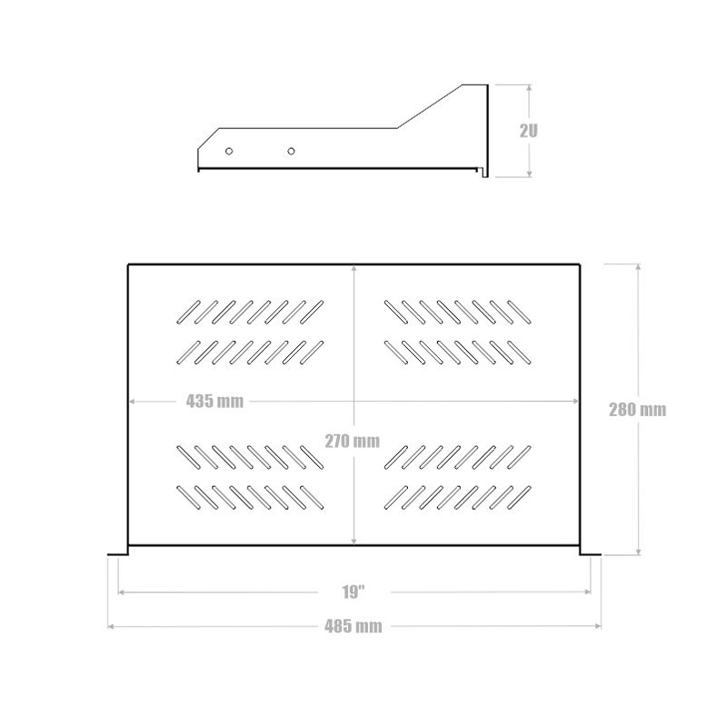 Polička s perforací 19" 2U 280 mm - 19" nízkoprofilová police 280 mm s uchycením 2U je vhodná pro umístění do 19" datového rozvaděče s hloubkou 400 mm a hlubšší. - Perforované tělo police umožňuje proudění vzduchu. - Tato police se instaluje pouze na přední vertikální lišty datového rozvaděče.