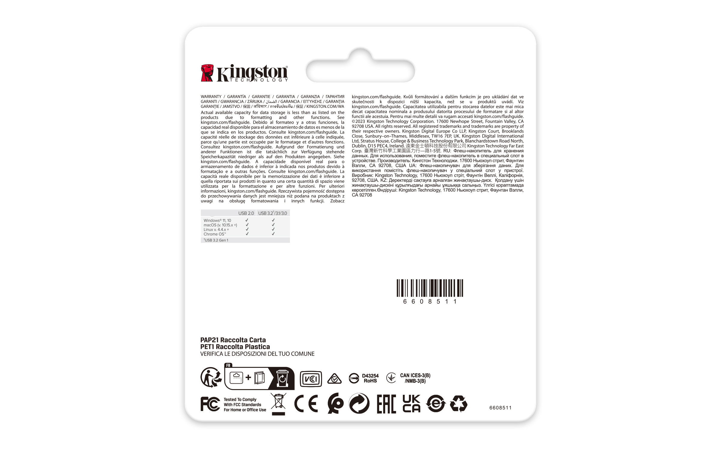 (B) Část z uvedené kapacity flash paměťového zařízení je využita pro formátování a další funkce, a proto není k dispozici pro ukládání dat. Jako taková je skutečná dostupná kapacita pro ukládání dat menší, než je uvedeno na produktech. Další informace naleznete v Průvodci flash paměťovými zařízeními od společnosti Kingston.