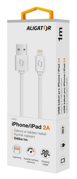Datový a nabíjecí pro iPhone/iPad s lightning konektorem ALIGATOR: *Vysoce kvalitní konektory *Vysoká rychlost přenosu dat *Možnost rychlého nabíjení 2A *Délka: 1m *Barva: bílá