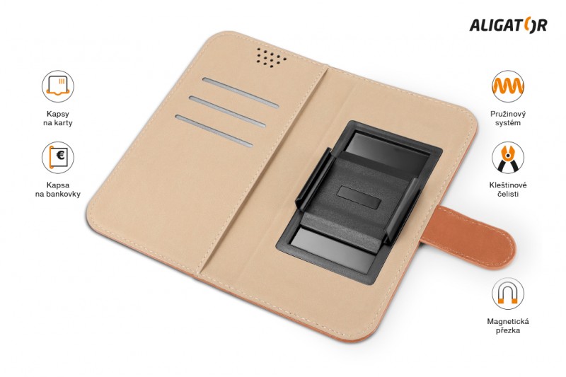 UNI-FIX Nová řada univerzálních pouzder s mechanizmem přítlačných čelistí značky ALIGATOR. Dokonale propracovaný design, tenké provedení, přihrádky na kartu nebo vizitky, podélná kapsa na bankovky, zavírání pomocí magnetické přezky, snadné uchycení mobilního telefonu pomocí výsuvných čelistí z kvalitního plastu, které jsou určené pro opakované umístění telefonu. Jednou z klíčových vlastností pouzdra je optimálně široký (hluboký) hřbet pouzdra, který je zároveň velmi tenký a jemně zpracovaný pro pohodlnou manipulaci. Rozměry samotného pouzdra jsou přizpůsobeny telefonům s novým poměrem stran displeje 18:9, ale zároveň jsou stále kompatibilní i s mobilními telefony s klasickým poměrem stran. Přední odklápěcí strana je vybavena přezkou se skrytým magnetickým zavíráním. Tato přezka je navržena pro maximální ochranu Vašeho mobilního telefonu. Polstrovaná podšívka, příjemná na omak, přispívá k ochraně displeje Vašeho mobilního telefonu, stejně jako prémiové přítlačné čelisti, které mají výsuvnou funkci a zároveň skvěle zafixují Váš mobilní telefon. Na vnitřní levé straně pouzdra najdete důmyslně skryté tři přihrádky na kreditní karty nebo vizitky a jednu podélnou kapsu pro bankovky. Pouzdro UNI-FIX je vyrobené z velmi kvalitní a odolné PU kůže, dostupné ve 4 barvách a 3 velikostech. Je pohodlným a reprezentativním doplňkem do kapsy i do kabelky. Pro maximální ochranu Vašeho mobilního telefonu doporučujeme používat toto pouzdro v kombinaci s řadou kvalitních univerzálních tvrzených skel ALIGATOR GLASS. * Univerzální pouzdro * Zavírání pomocí magnetické přezky * Přítlačné posuvné čelisti pro uchycení mobilního telefonu * Otvory pro reproduktor k pohodlnému vyřizování hovorů * Přihrádky na karty nebo vizitky * Kapsa na bankovky * Tenké provedení * Kvalitní zpracování * Elegantní design * Snadné uchycení a vyjmutí mobilního telefonu * Použití fotoaparátu bez nutnosti vyjmout telefon z pouzdra s pomocí výsuvného systému Dostupné univerzální velikosti: * L 150*72*20mm * XL 160*82*20mm * XXL 170*83*20mm Široká škála barev: * Černá * Hnědá * Červená