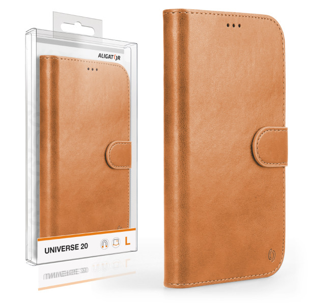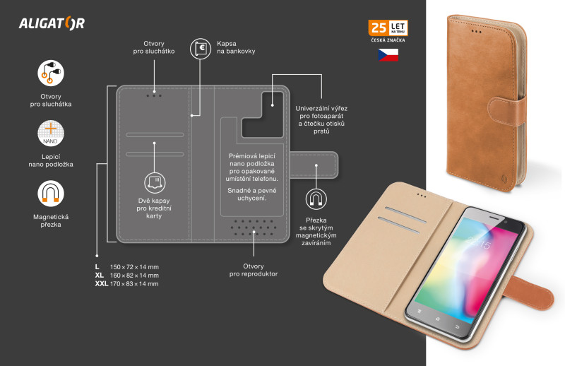 Nová řada univerzálních pouzder značky ALIGATOR. Dokonale propracovaný design, tenké provedení, přihrádka na kartu nebo vizitky, podélná kapsa na bankovky, zavírání pomocí magnetické přezky, snadné uchycení mobilního telefonu pomocí prémiové lepicí nano podložky, která je určena pro opakované umístění telefonu. Zadní výřez pro fotoaparát a čtečku otisku prstu je navržen tak, aby byl kompatibilní s většinou mobilních telefonů. Jednou z klíčových vlastností pouzdra je optimálně široký (hluboký) hřbet pouzdra, který je zároveň velmi tenký a jemně zpracovaný pro pohodlí při manipulaci. Rozměry samotného pouzdra jsou přizpůsobeny telefonům s novým poměrem stran displeje 18:9, ale zároveň jsou stále kompatibilní i s klasickými mobilními telefony. Přední odklápěcí strana je vybavena přezkou se skrytým magnetickým zavíráním. Tato přezka je navržena pro maximální ochranu Vašeho mobilního telefonu. Polstrovaná podšívka, příjemná na omak, přispívá k ochraně displeje Vašeho mobilního telefonu, stejně jako prémiová nano podložka, která zároveň skvěle fixuje mobilní telefon a slouží k opakovanému použití. Na vnitřní levé straně pouzdra najdete důmyslně skryté dvě přihrádky na kreditní kartu, nebo vizitky a jednu podélnou kapsu pro bankovky. Pouzdro UNIVERSE 20 je vyrobené z velmi kvalitní a odolné PU kůže, dostupné v 5 barvách a 3 velikostech. Je pohodlným a reprezentativním doplňkem do kapsy i do kabelky. Pro maximální ochranu Vašeho mobilního telefonu doporučujeme používat toto pouzdro v kombinaci s řadou kvalitních univerzálních tvrzených skel ALIGATOR GLASS. *Univerzální pouzdro *Zavírání pomocí magnetické přezky *Přihrádka na kartu nebo vizitky *Kapsa na bankovky *Tenké provedení *Kvalitní zpracování *Elegantní design *Snadné uchycení mobilního telefonu pomocí prémiové nano podložky *Nano podložka slouží k opakovanému umístění mobilního telefonu