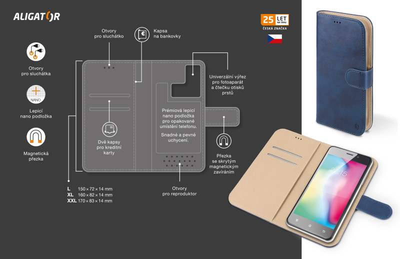Nová řada univerzálních pouzder značky ALIGATOR. Dokonale propracovaný design, tenké provedení, přihrádka na kartu nebo vizitky, podélná kapsa na bankovky, zavírání pomocí magnetické přezky, snadné uchycení mobilního telefonu pomocí prémiové lepicí nano podložky, která je určena pro opakované umístění telefonu. Zadní výřez pro fotoaparát a čtečku otisku prstu je navržen tak, aby byl kompatibilní s většinou mobilních telefonů. Jednou z klíčových vlastností pouzdra je optimálně široký (hluboký) hřbet pouzdra, který je zároveň velmi tenký a jemně zpracovaný pro pohodlí při manipulaci. Rozměry samotného pouzdra jsou přizpůsobeny telefonům s novým poměrem stran displeje 18:9, ale zároveň jsou stále kompatibilní i s klasickými mobilními telefony. Přední odklápěcí strana je vybavena přezkou se skrytým magnetickým zavíráním. Tato přezka je navržena pro maximální ochranu Vašeho mobilního telefonu. Polstrovaná podšívka, příjemná na omak, přispívá k ochraně displeje Vašeho mobilního telefonu, stejně jako prémiová nano podložka, která zároveň skvěle fixuje mobilní telefon a slouží k opakovanému použití. Na vnitřní levé straně pouzdra najdete důmyslně skryté dvě přihrádky na kreditní kartu, nebo vizitky a jednu podélnou kapsu pro bankovky. Pouzdro UNIVERSE 20 je vyrobené z velmi kvalitní a odolné PU kůže, dostupné v 5 barvách a 3 velikostech. Je pohodlným a reprezentativním doplňkem do kapsy i do kabelky. Pro maximální ochranu Vašeho mobilního telefonu doporučujeme používat toto pouzdro v kombinaci s řadou kvalitních univerzálních tvrzených skel ALIGATOR GLASS. *Univerzální pouzdro *Zavírání pomocí magnetické přezky *Přihrádka na kartu nebo vizitky *Kapsa na bankovky *Tenké provedení *Kvalitní zpracování *Elegantní design *Snadné uchycení mobilního telefonu pomocí prémiové nano podložky *Nano podložka slouží k opakovanému umístění mobilního telefonu