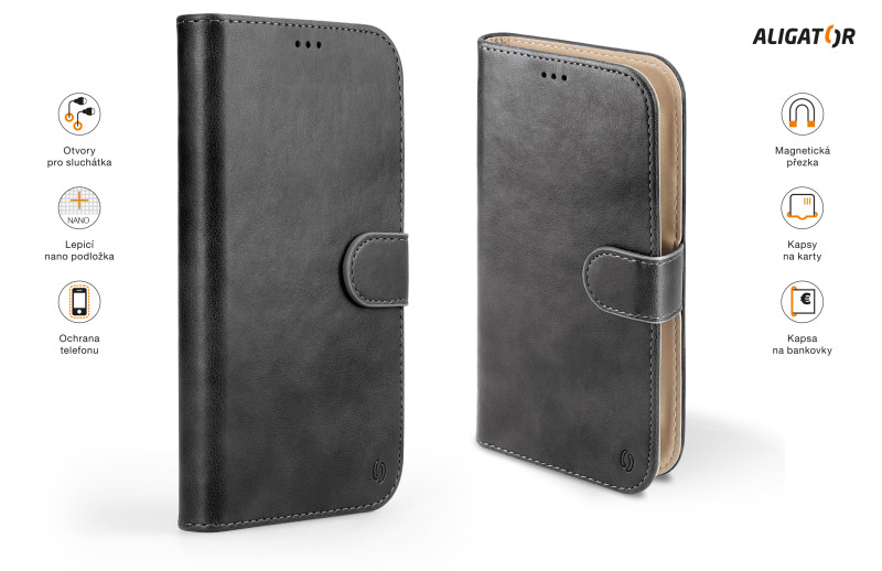 Nová řada univerzálních pouzder značky ALIGATOR. Dokonale propracovaný design, tenké provedení, přihrádka na kartu nebo vizitky, podélná kapsa na bankovky, zavírání pomocí magnetické přezky, snadné uchycení mobilního telefonu pomocí prémiové lepicí nano…