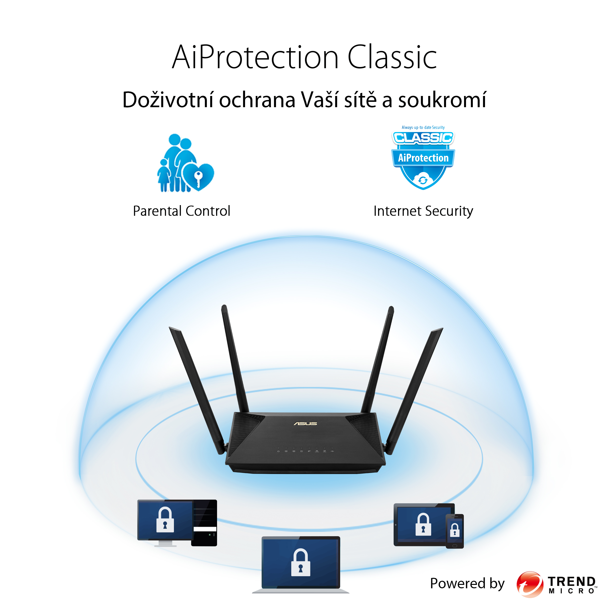 RT-AX53U obsahuje ASUS AiProtection, síťový bezpečnostní systém komerční úrovně založený na technologii Trend Micro Smart Home Network. Díky AiProtection jsou chráněna všechna připojená zařízení, i když nemají vlastní antivirovou ochranu – například zařízení internetu věcí. AiProtection blokuje běžné internetové útoky ještě předtím, než se dostanou do sítě. Jakmile je v síti detekováno infikované zařízení, AiProtection ho okamžitě zablokuje, aby se zabránilo odesílání jakýchkoli osobních informací na škodlivé servery.