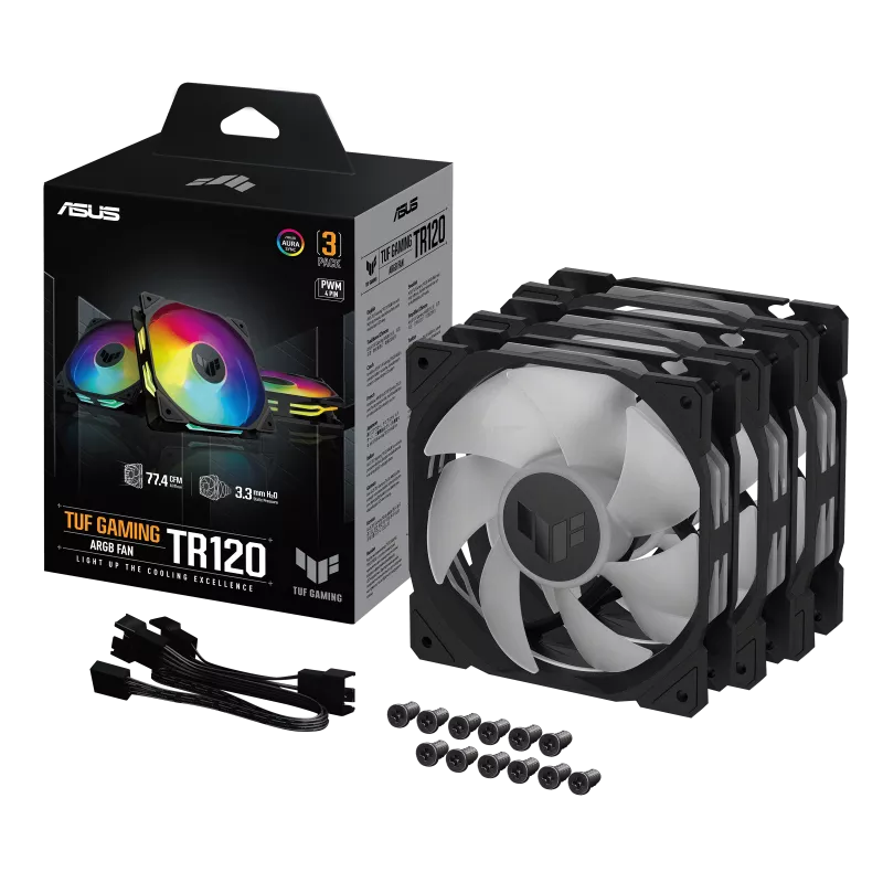 TUF Gaming TR120 ARGB Fan - Triple Pack Velikost ventilátoru: 120 x 120 x 28 mm Ložisko ventilátoru: Hydraulické Rychlost ventilátoru: 2000 RPM(+/- 10%) Airflow: 77.4 CFM Hluk ventilátoru: 29 dB(A) AURA SYNC