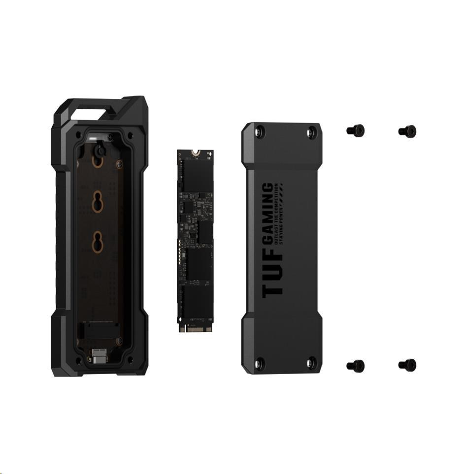 ASUS TUF Gaming A2, černý Pouzdro USB-C 3.2 Gen 2x2 SSD, dvě rozhraní M.2 NVMe PCIe a SATA, M.2 Q-Latch pro snadnou instalaci, odolnost proti pádu MIL-STD-810H, odolnost proti vodě a prachu IP68, vylepšený vnější povrch ze silikonové pryže,…
