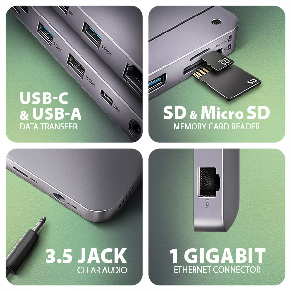 dva monitory, čtyři USB zařízení, Gigabitovou ethernet síť, sluchátka, čtečku SD karet a NVMe nebo SATA M.2 SSD disk. Zároveň získáte možnost napájení notebooku pomocí technologie