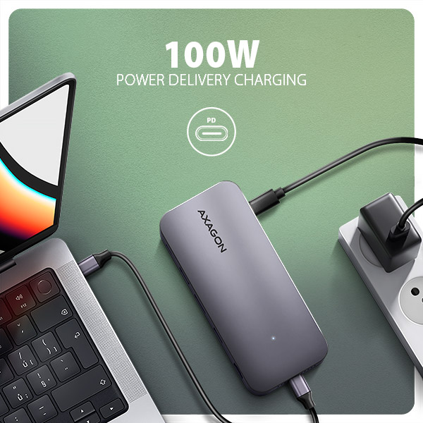 Power Delivery 3.0 výkonem až 100W. Do hubu zapojíte vhodnou USB-C Power Delivery nabíječku a hub připojíte k notebooku s podporou Power Delivery. Tím také uvolníte jeden USB-C port.