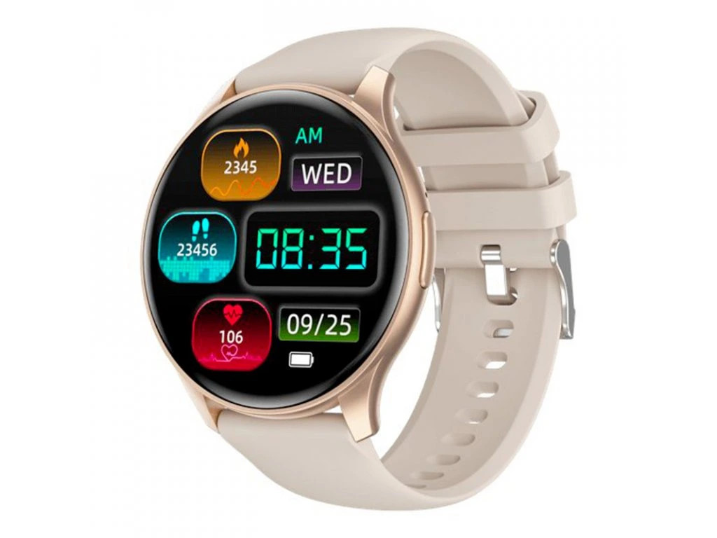 Moderní, fitness hodinky CARNEO Gear Essential druhé generace ve zlaté barvě s béžovým na dotek velmi příjemným silikonovým řemínkem a barevným SUPER AMOLED displejem s vysokým jasem a funkcí trvalého zobrazení času. Monitorují vaši denní aktivitu, úroveň stresu a lze je spárovat s mobilním telefonem a upozornit Vás na příchozí hovor nebo SMS. Hodinky umožňují telefonovat, aniž byste vytáhli telefon z tašky s vestavěným mikrofonem a reproduktorem až do vzdálenosti 10 m od telefonu.