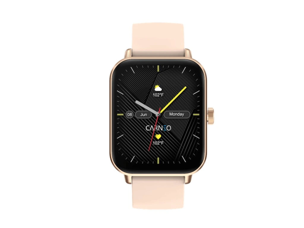 Moderní fitness hodinky Carneo Versa HR+ v elegantním růžovozlatém provedení jsou vybaveny barevným displejem IPS, který lze aktivovat pouhým otočením ruky. Měří tělesnou teplotu, krevní tlak, okysličení krve, srdeční tep, ušlou vzdálenost, monitorují spálené kalorie a kvalitu spánku. Jejich součástí je baterie s výdrží cca 3-5 dní. Podle certifikace IP67 jsou odolné vůči vodě a prachu. Hodinky s podporou technologie Bluetooth jsou kompatibilní s operačním systémem iOS a Android. Silikonový náramek s kovovou přezkou je příjemný na dotek a zaručuje komfort během celého dne.