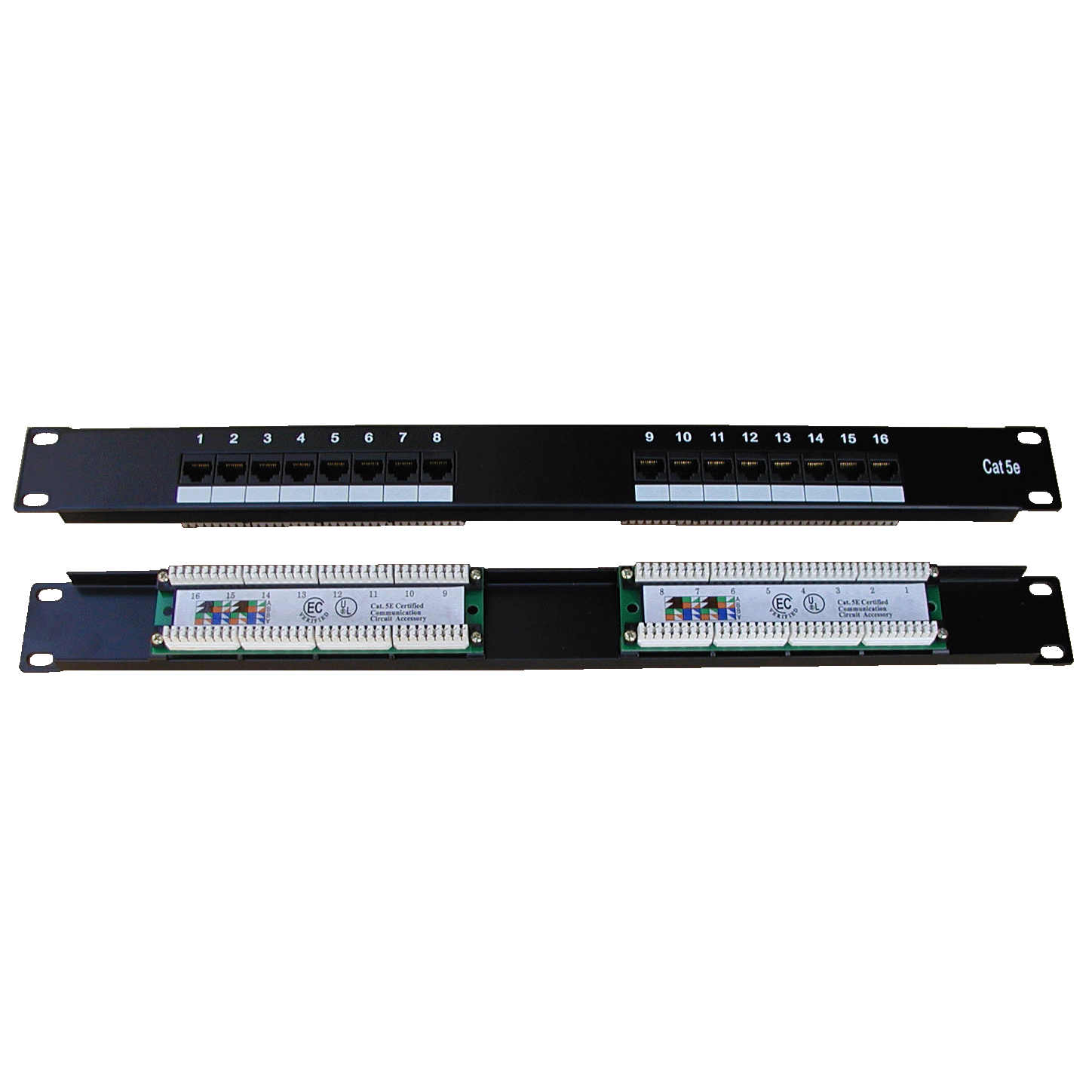 19" UTP Patch panel 16 port - kompletní osazený patch panel - 19" Patch panel určený pro montáž do 19" datových rozvaděčů. - zářezové pole typu LSA (krone) - výška 1U - zadní zářez - barva černá - nestíněný