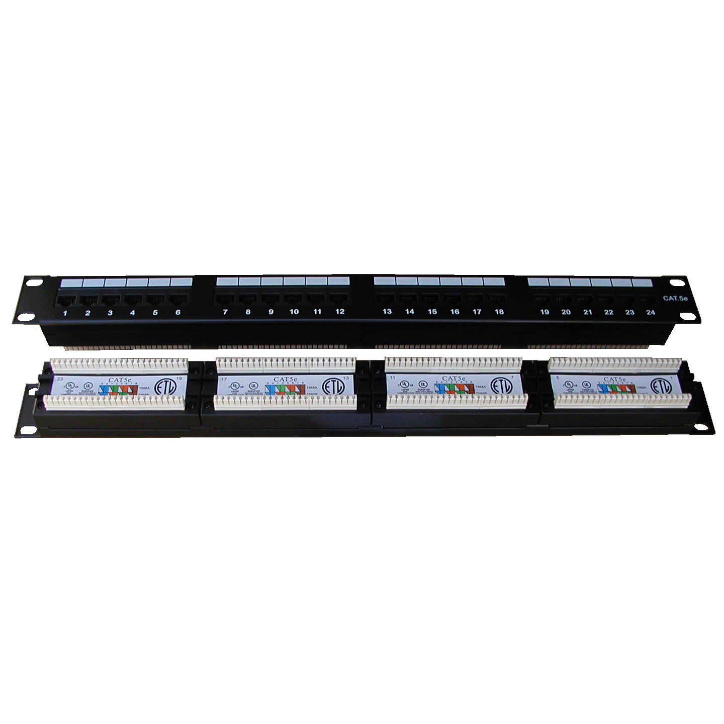 19" UTP Patch panel Cat.5e 24 port - kompletní osazený patch panel - 19" Patch panel určený pro montáž do 19" datových rozvaděčů - duální (zařezávání kabelů možno LSA i 110) - výška 1U - zadní zářez - barva černá - nestíněný - konektory se zasunují kolmo