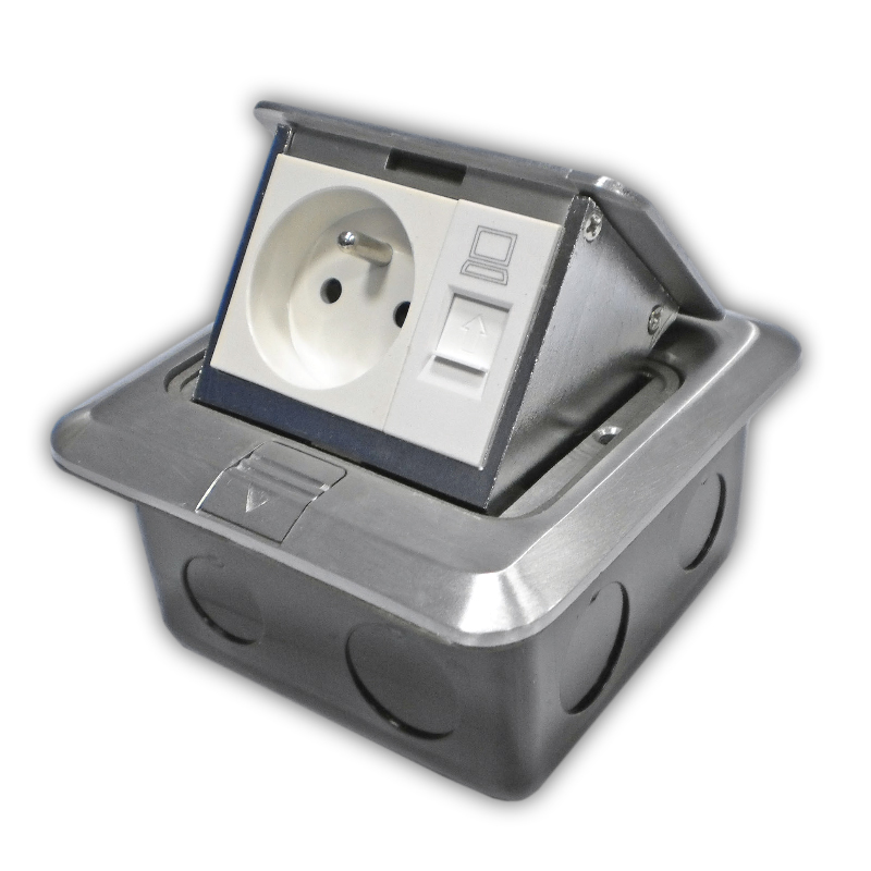 Podlahová zásuvka RJ45+230V *zásuvka 1x 230V (kolík) + 1 x RJ45 včetně keystonu RJ45 cat.5e *včetně instalační podlahové krabice *vystřelovací otevírání *hliníkové provedení *rozměry: 122 x 122 x 65 mm Montáž a zapojení musí provádět odborná firma/resp.pracovník s potřebnou kvalifikovanou odborností. Upozornění Tato zásuvka má od výroby zapojenu fázi vpravo od kolíku při čelním pohledu na zásuvku.