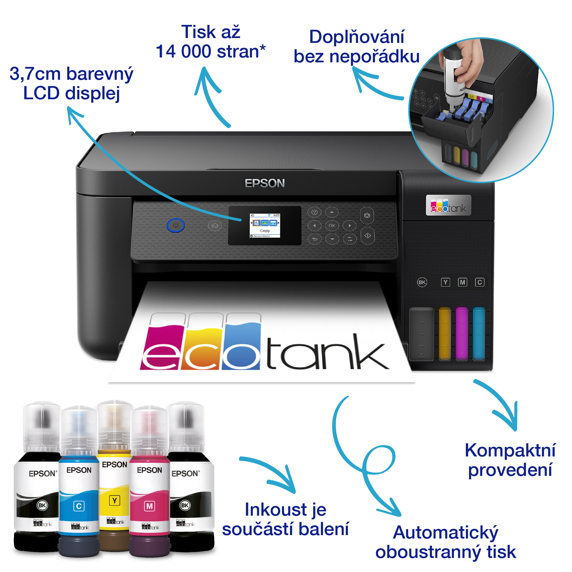 Dejte sbohem inkoustovým kazetám Vychutnejte si mimořádně úsporný bezdrátový tisk s touto multifunkční tiskárnou EcoTank bez inkoustových kazet a s oboustranným tiskem. Ušetřete až 90 % nákladů na tisk s tiskárnami EcoTank od společnosti Epson bez inkoustových kazet. Integrované inkoustové nádržky s velkoobjemovými lahvičkami s inkoustem se snadno doplňují díky speciálně navrženým lahvičkám. Bez nutnosti výměny inkoustových kazet a flexibilními funkcemi připojení je to dokonalá tiskárna pro každého, kdo hledá vysoce kvalitní výtisky za neuvěřitelně nízké náklady na tisk jedné strany. * Tisková hlava Epson Micro Piezo * Pigment black and Dye colour Inks * Tiskárna, skener, kopírka