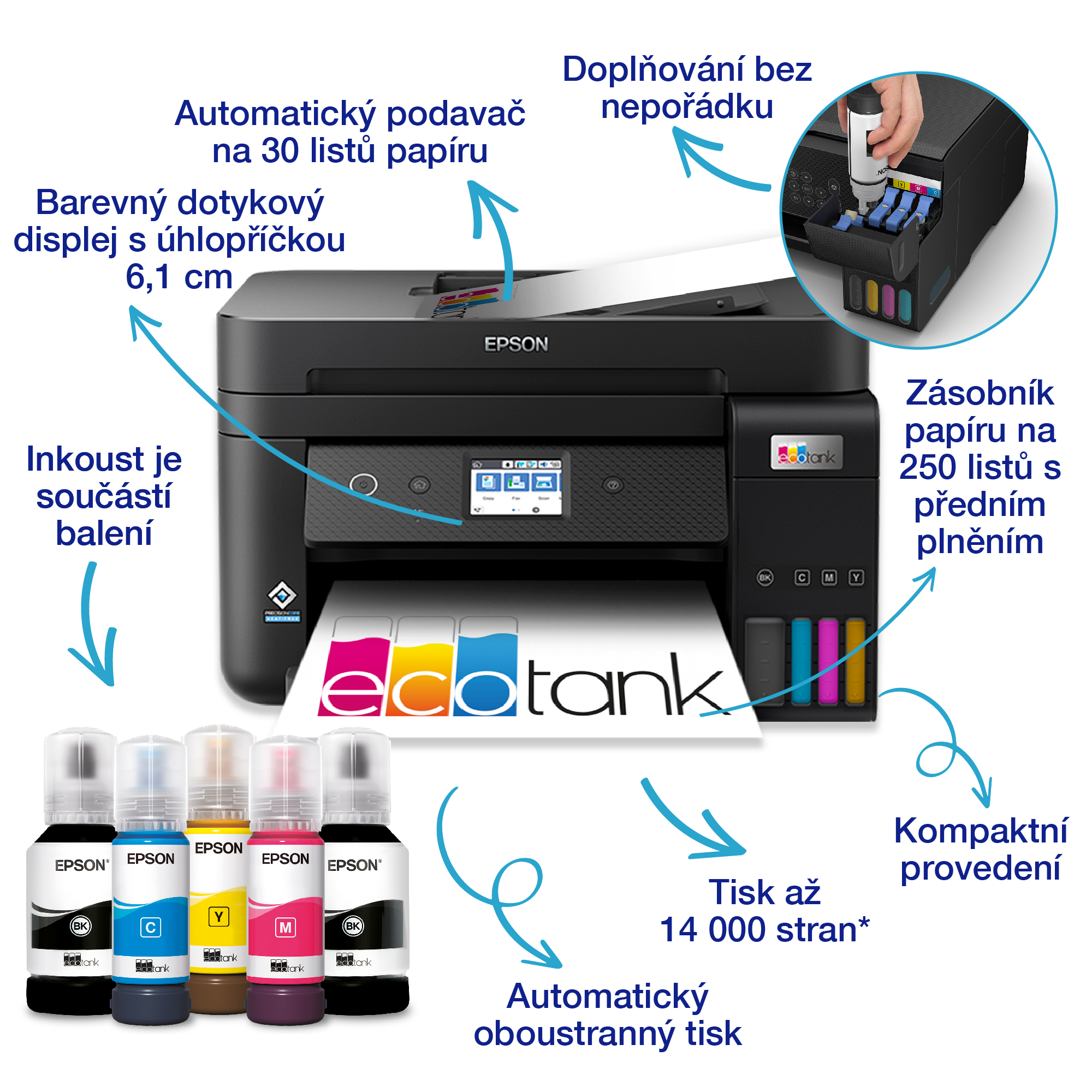 Ušetřete až 90 % nákladů na tisk s tiskárnami EcoTank od společnosti Epson bez inkoustových kazet. Integrované inkoustové nádržky s velkoobjemovými lahvičkami s inkoustem se snadno doplňují díky speciálně navrženým lahvičkám. Bez nutnosti výměny inkoustových kazet a flexibilními funkcemi připojení je to dokonalá tiskárna pro každého, kdo hledá vysoce kvalitní výtisky za neuvěřitelně nízké náklady na tisk jedné strany.
