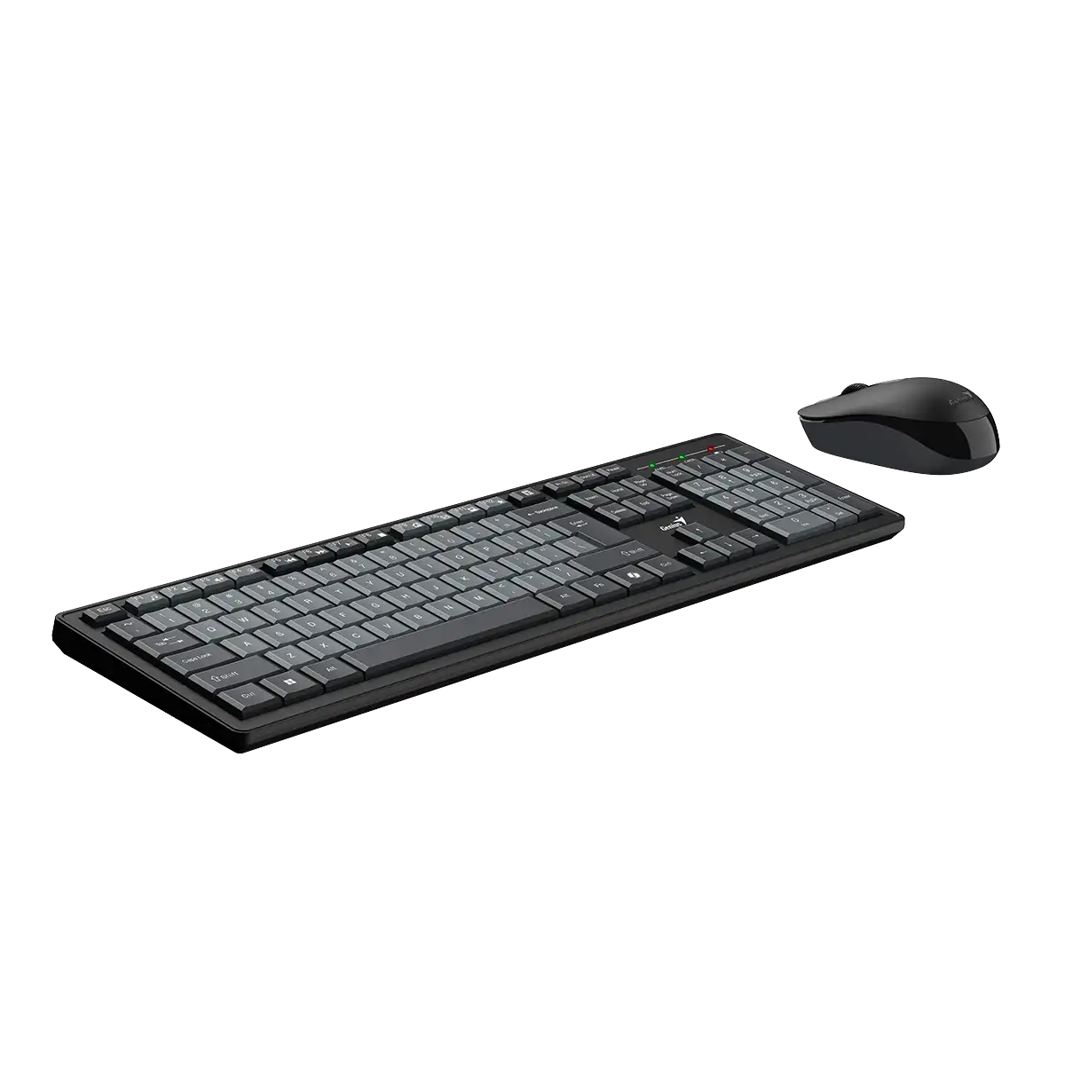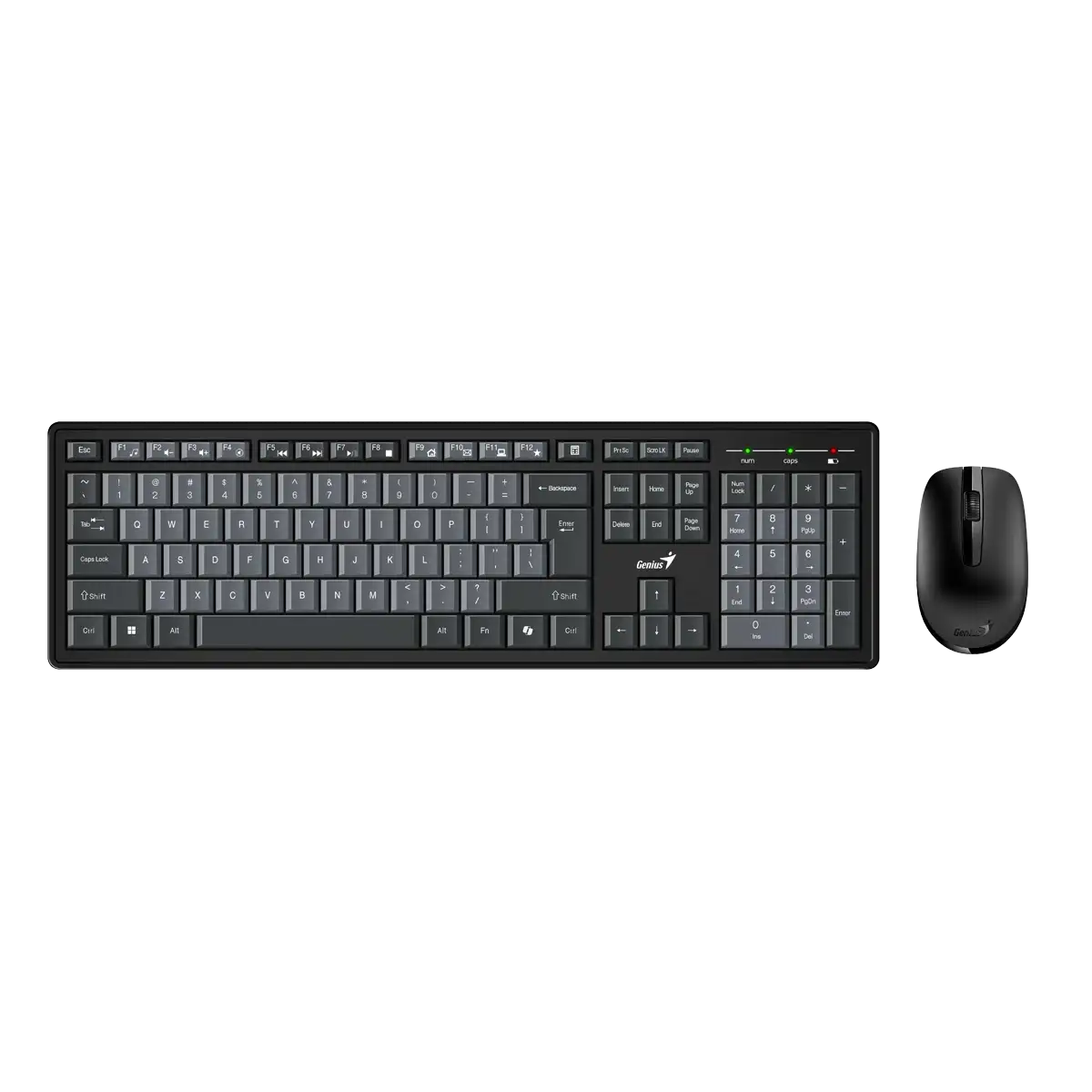 Bezdrátová sada Genius KM-8200 má dvoubarevné šedé klávesy a její bezdrátová optická myš bez kabelu usnadňuje pohyb kurzoru.