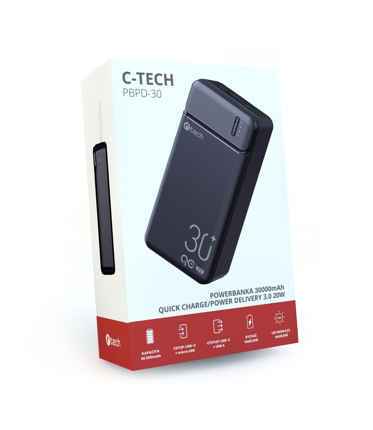 Powerbanka C-tech 30000mAh, Li-Pol, 20W, USB-C/USB-A/micro USB