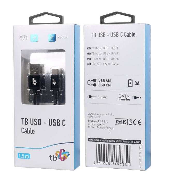 TB Cable USB - USB C 1.5 m black tape premium Délka kabelu: 1,5 m Konektory: *USB Type A Male *USB Type C Male Standard: USB 2.0 Barva: černá *Kabel má integrovaný rezistor 56K ohmů.