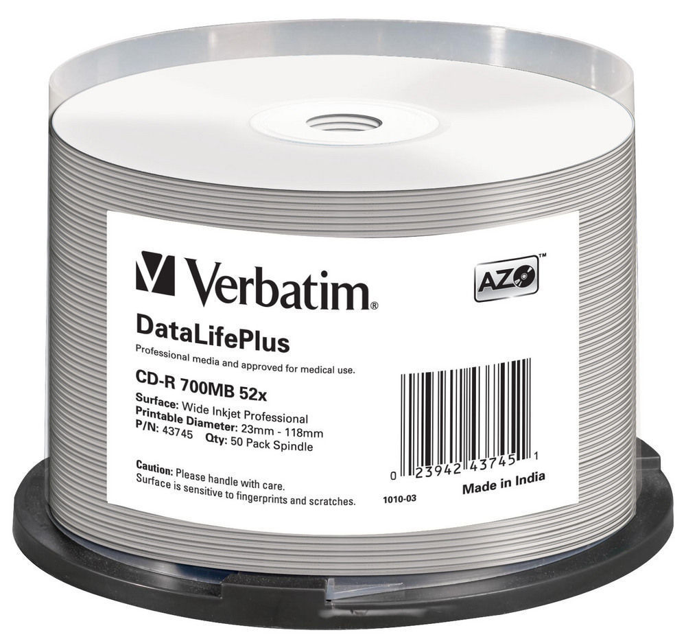 Profesionální optická média Verbatim splňují přísnější specifikace, než jsou standardy jejich patřičných subjektů. Přísnější specifikace zajišťují vyšší kompatibilitu se zapisovacími a přehrávacími jednotkami. To má za následek vyšší kvalitu přehrávání, tedy i delší dobu archivace a lepší čitelnost. Profesionální optická média Verbatim rozpoznáte podle značky DataLifePlus. Disky Verbatim CD-R/RW využívají technologii MKM/Verbatim, která zajišťuje, že každá nahrávka bude v té nejvyšší kvalitě. Díky vývojovému středisku společnosti Mitsubishi Chemical a silné spolupráci s výrobci jednotek je zajištěna široká kompatibilita disků Verbatim, které tak jsou ideálním řešením pro sdílení počítačových dat, domácích videí, fotografií a hudby. Od evropské jedničky* v oblasti zapisovatelných médií * SCCG CD/DVDR /03 - /09. Disk CD-R je zapisovatelný disk, který poskytuje kapacitu 700 MB. V souladu se specifikacemi Oranžové knihy, část II, verze 3. Mechanické technické požadavky na média Verbatim jsou velmi přesné a data na nich zapsaná lze načíst širokou škálou jednotek. Z toho důvodu vykazují disky Verbatim vysoký stupeň kompatibility s jednotkami s různými rychlostmi zápisu. Vynikající odolnost vůči UV záření Životnost: technologie Extra Protection – až 40 let; technologie AZO – až 100 let, nejnižší stupeň výskytu chyb při použití široké škály zapisovacích jednotek CD. Široký, bílý, inkoustem potisknutelný disk má bílý povrch, na který je možno tisknout, až k náboji a potisknutelný průměr 23-118 mm
