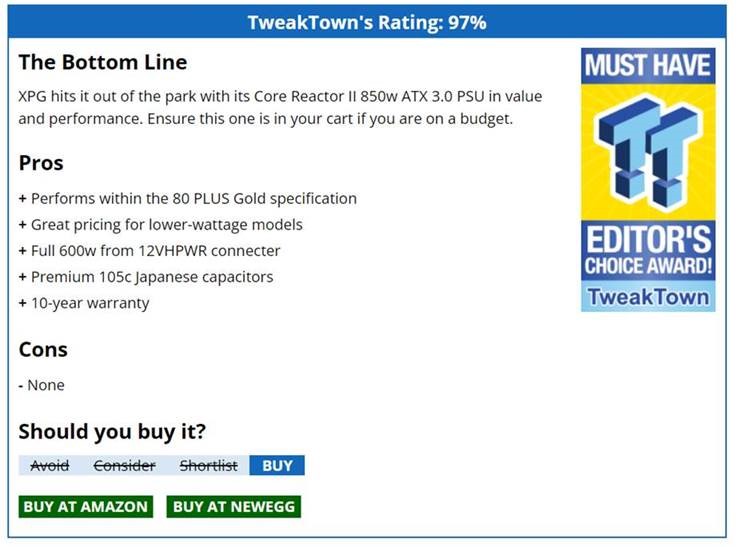 Parametry - XPG CORE REACTOR II 850W 80+GOLD